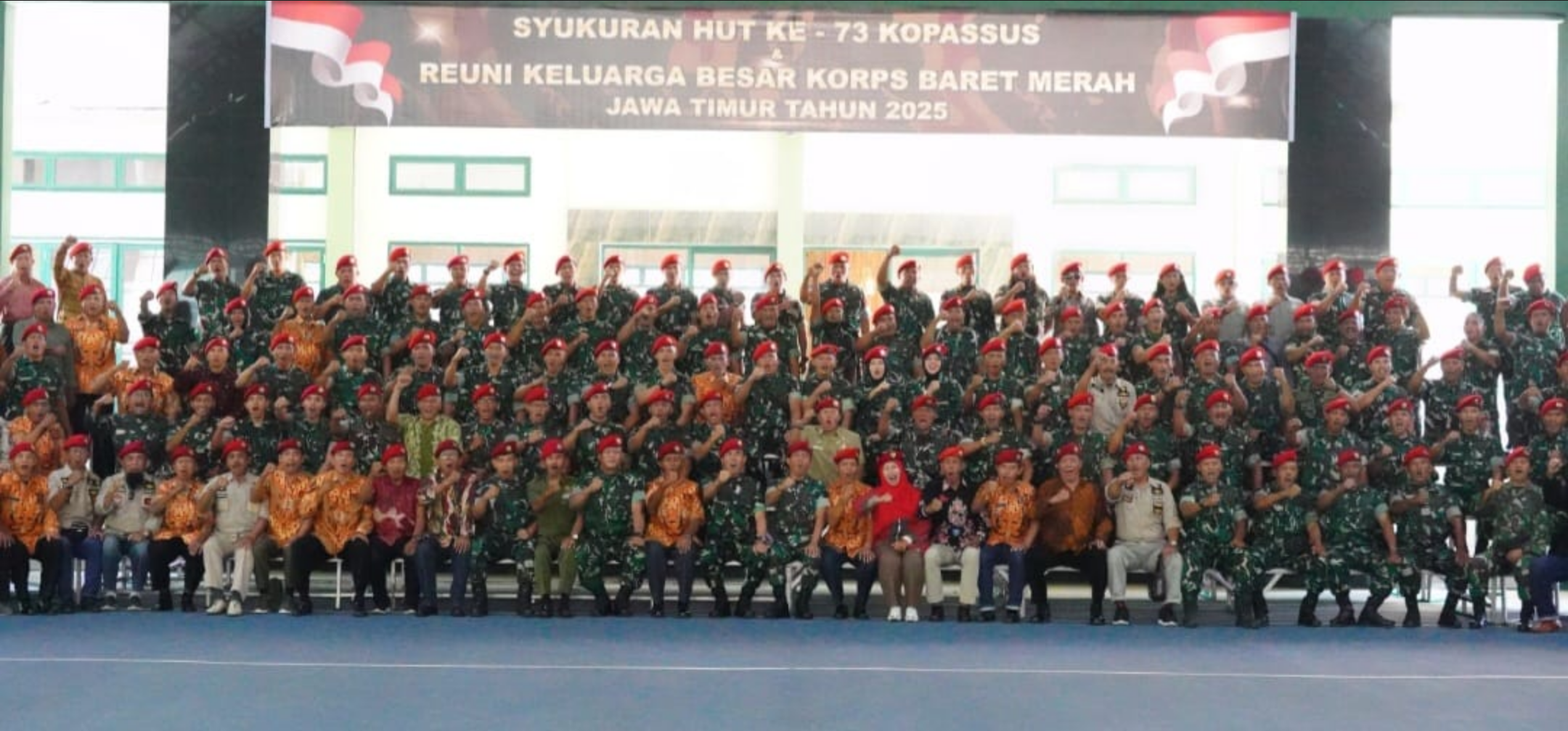 Malang (29/04/2025) | www.wongbodhojournalist.site/– Sekitar 300 anggota keluarga besar Baret Merah se-Jawa Timur berkumpul dengan penuh kebersamaan dalam acara syukuran dan reuni memperingati HUT ke-73 Kopassus. Acara digelar di Gedung Sandoyo, Markas Divisi Infanteri 2/Kostrad Singosari, Malang, dengan suasana hangat dan penuh semangat.