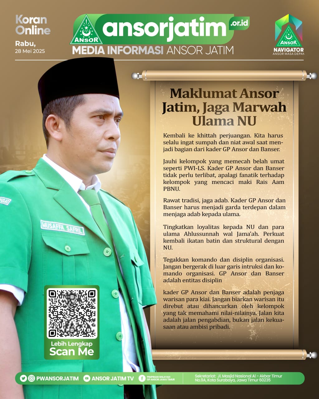 “Saya mohon kepada teman-teman di bawah, baik dari PWI, Laskar Sabilillah, maupun Banser dan Ansor, untuk tidak terprovokasi. Dari pihak Ansor tidak ada masalah dengan PWI, dan tidak ada tekanan apa pun dalam pernyataan Gus Sakhoiri sebelumnya.”